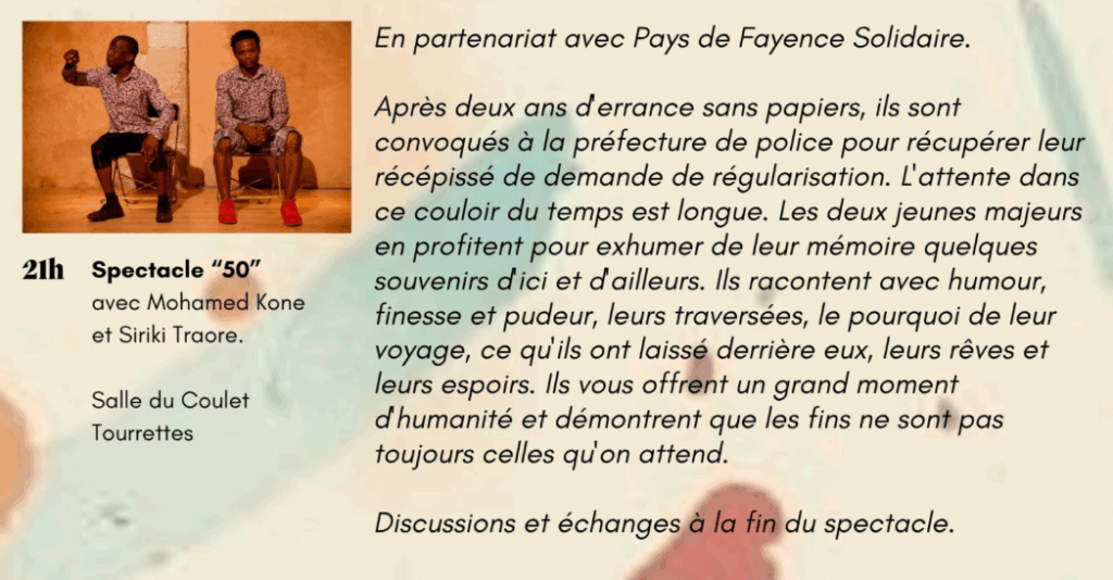 Leur odyssée racontée par leur création théâtrale 50 nous avait impressionnés et leur sincérité nous avait touchés. Ils ont continué depuis leur parcours de comédiens encouragés par les associations qui leur ont permis un jour de réaliser leur rêve. Leur spectacle a eu une belle reconnaissance à Avignon où il a été récompensé cette année et il tourne dans les lycées, les théâtres, en France (à la Réunion notamment) , en Suisse.