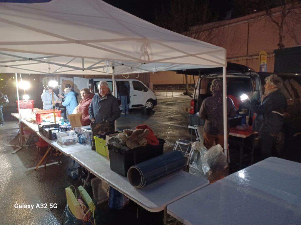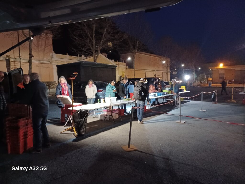 La nuit déjà tombée, nous avons installé tables, rubalises, et lumières pour nous éclairer. Le vent n’était pas si fort qu’à Fayence et alentours mais il faisait très froid. Une cinquantaine de réfugiés nous attendait et nous nous demandions où chacun d’entre eux allait trouver un abri pour la nuit.