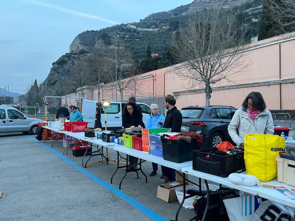 La météo fut clémente. Une fois les gros thermos de café et de thé préparés, quatre véhicules chargés à bloc à Tassy ont pris la route vers 16h. Sur le parking habituel de Vintimille, Danielle et Rosario, déjà arrivés avec leur voiture, nous ont accueillis, tous sourires. L’installation fut rapide. Nous étions douze bénévoles.