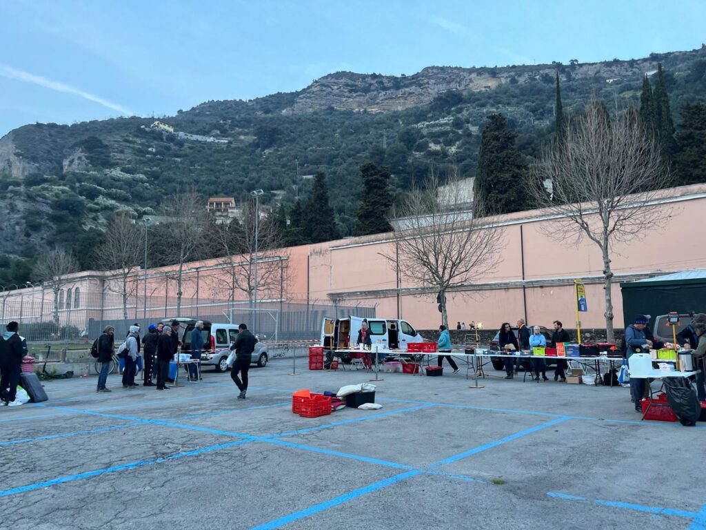 Nous arrivons à Vintimille à 18h. Il fait déjà nuit, mais bonne surprise : il n’y a pas de vent. L’installation se déroule sans difficulté, chacun sait quoi faire. Rapidement, une file d’une trentaine de personnes se forme pour attendre un repas chaud.