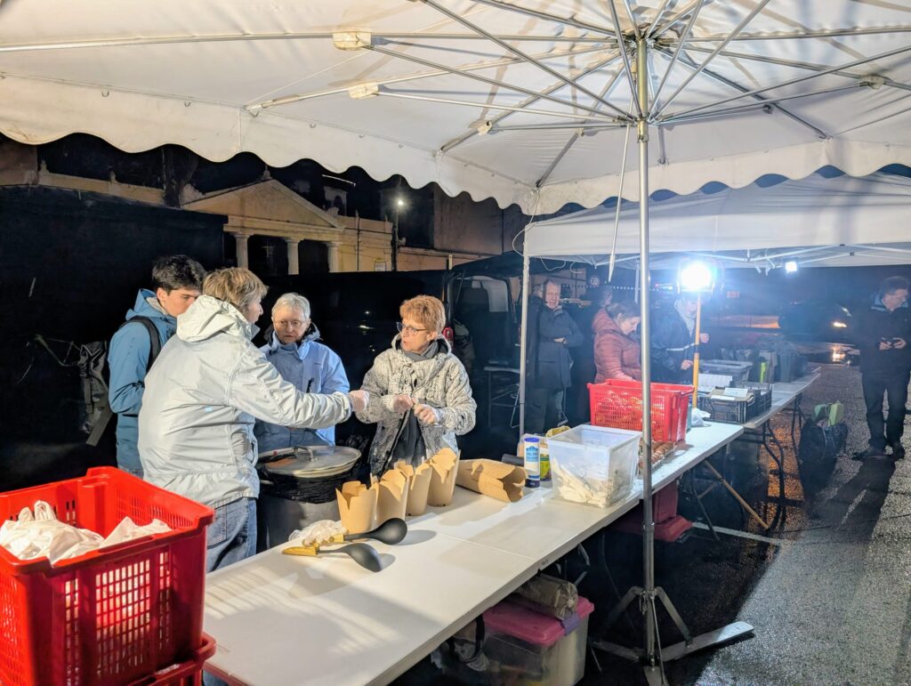 La météo ce samedi était menaçante et nous avons décidé de monter les barnums pour se protéger de la pluie. Mais finalement celle-ci a été faible et de courte durée, et ces barnums éclairés ont plutôt contribué à créer une ambiance plus conviviale au dispositif de la distribution.