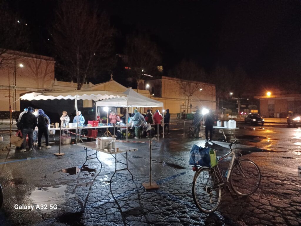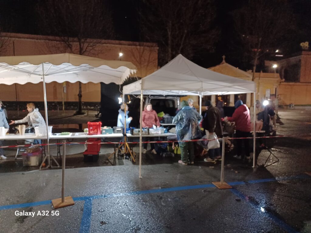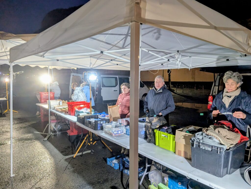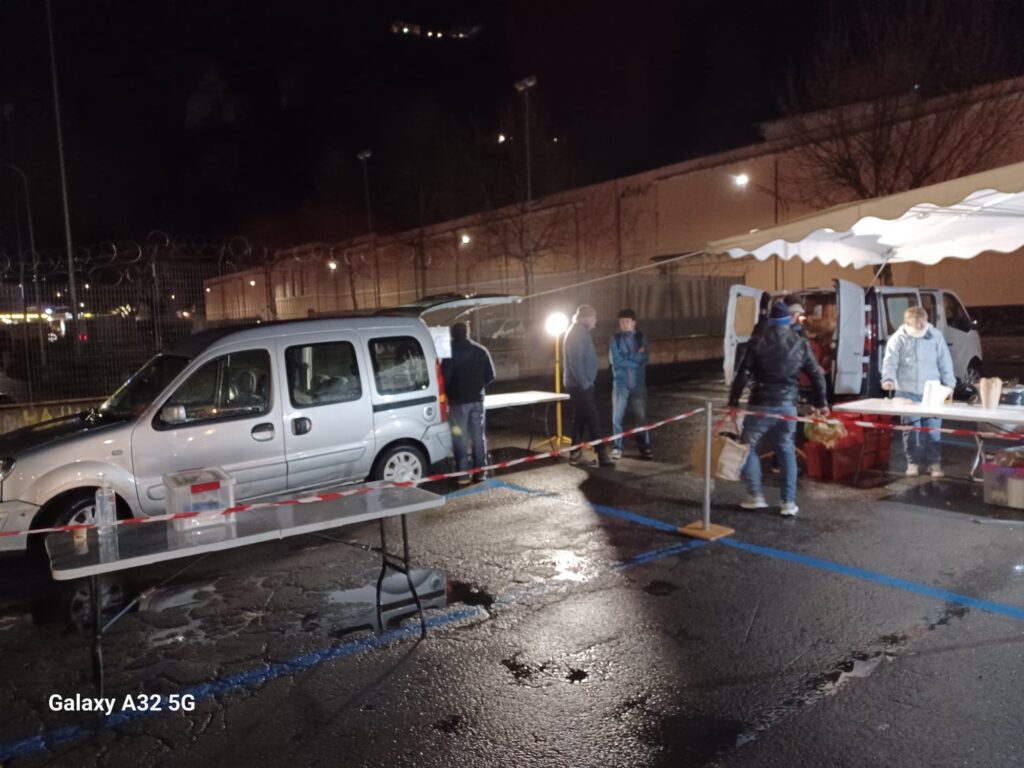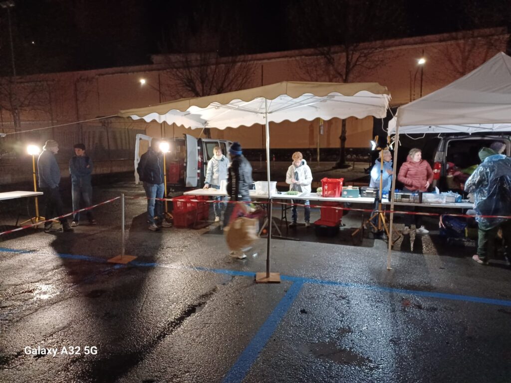 Première maraude pour moi. Après des mois à participer aux collectes du samedi matin, je saute le pas et demande à participer à la maraude du soir. J’ai pu constater avec quelle organisation tout se met en place une fois à Vintimille malgré la pluie et la pénombre. Une véritable chorégraphie répétée chaque mois depuis des années. Les tables et les chaises s’installent sous les chapiteaux et les spots éclairent. Puis la distribution commence chacun à son poste, chacun sa tâche. Je n’ai qu’à suivre les instructions de ceux qui mènent cette mission depuis des mois et même des années.