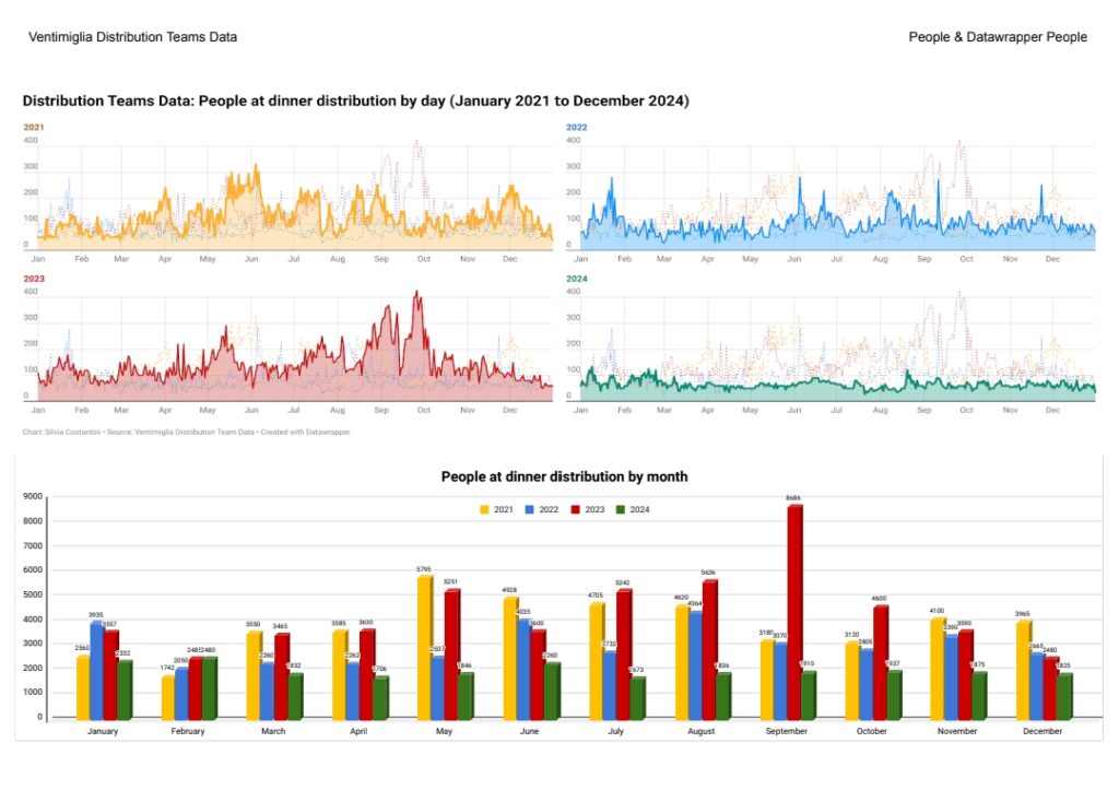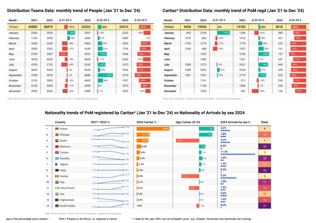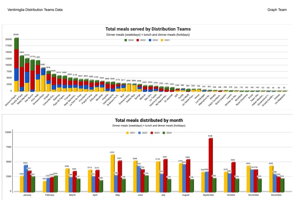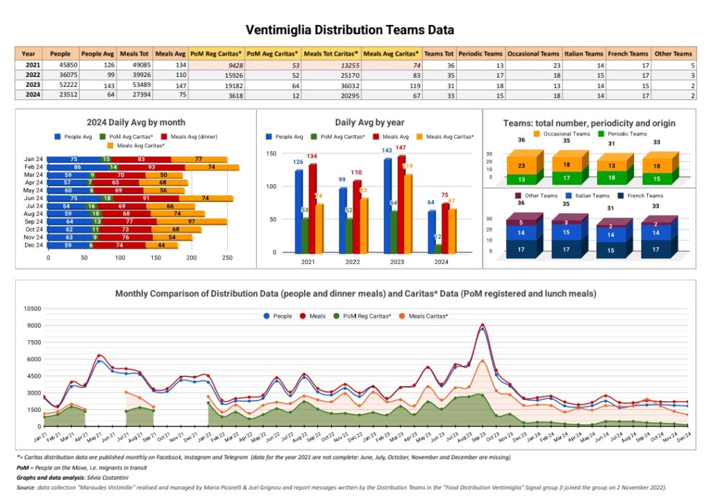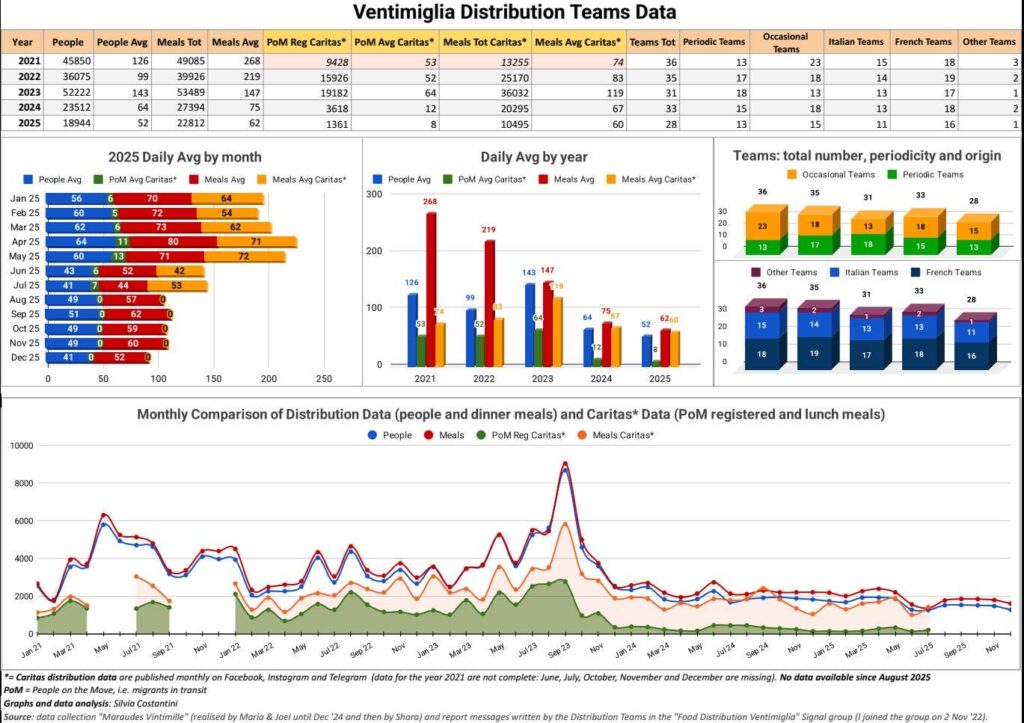 On constate depuis 2023 une baisse importante du nombre de migrants présents à Vintimille et du nombre de repas qui y sont distribués. Cette évolution est le résultat de nombreux facteurs, dont notamment :