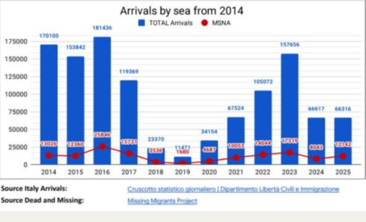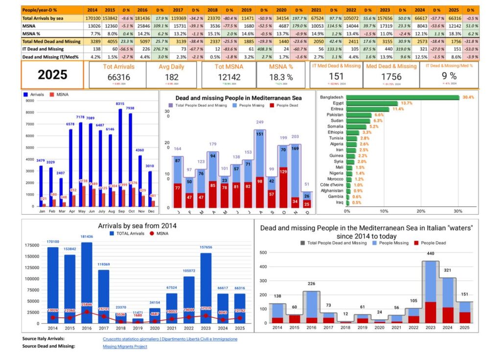 - 151 people dead and missing in ‘Italian waters’ (-57% vs. 2024) : 9% compared to 12% in 2024