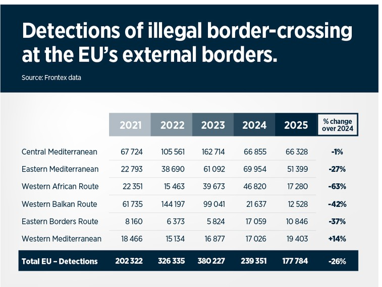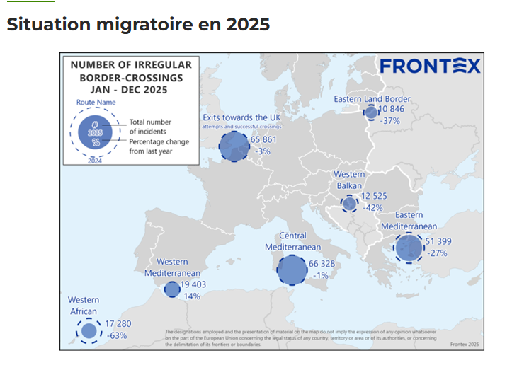 « En 2025, la Méditerranée centrale est restée la principale voie migratoire vers l’UE, avec des taux de détection globalement similaires à ceux de 2024. Les départs de Libye sont restés un facteur clé influençant les mouvements migratoires vers l’Italie. »